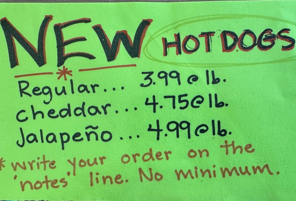 Whole or half pig. Chops, roasts, ribs, bacon (fresh or smoked), ham (fresh, smoked, or cured), ground pork, and custom sausages (breakfast, Italian sweet/hot, chorizo, bratwurst).